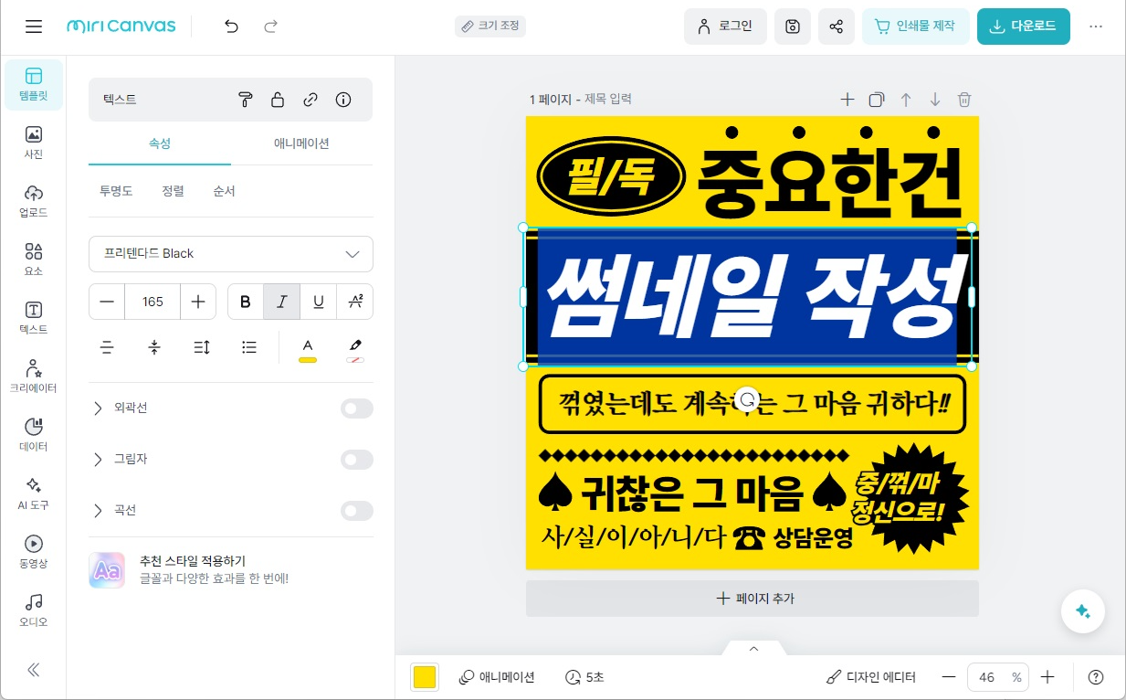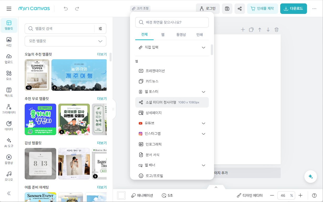 왼쪽에 위치한 다양한 메뉴로 사진 배경, 요소(도형, 일러스트 등), 텍스트를 이용하여 꾸밀 수 있고 템플릿(이미 만들어진 틀)에 글자만 수정하여 사용할 수 있습니다.