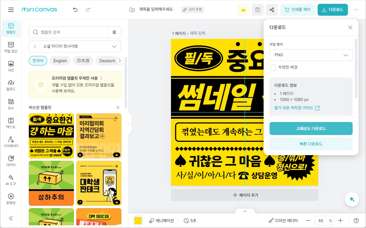 해당 사이트에서 정방형(1:1 비율)으로 새 디자인을 생성한 후 템플릿에서 적절한 배경을 받아서 작성합니다. 사이즈는 마음대로 정해도 되지만 대부분 썸네일은 1:1 비율로 500*500px, 1000*1000px처럼 같은 크기로 만드는 것이 좋습니다.